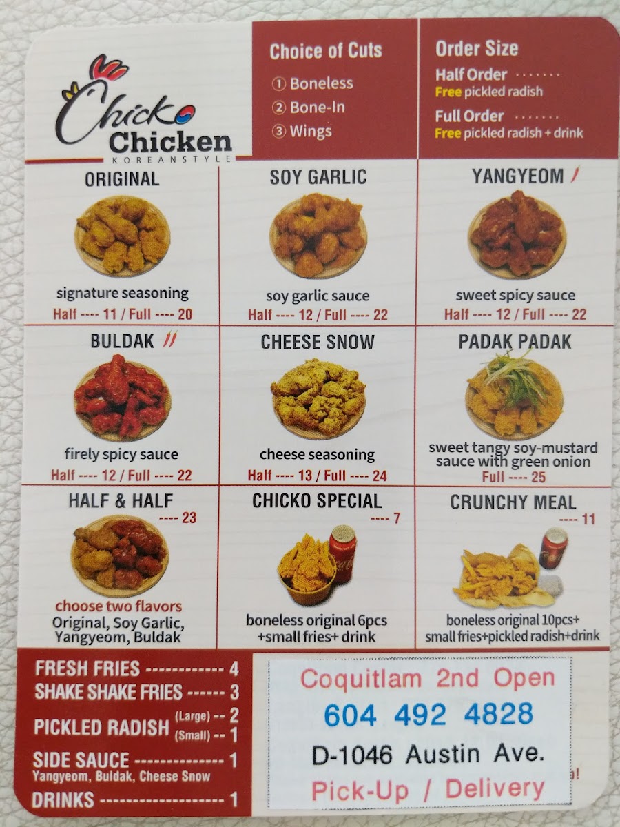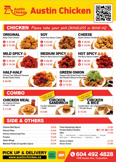 Welcome to Austin Chicken, Coquitlam's newest gem for all chicken lovers, where you can experience Korean-style fried chicken that will leave your taste buds craving for more. Situated conveniently at 1046 Austin Ave Unit D, Coquitlam, BC V3K 3P3, Canada, Austin Chicken has quickly become a beloved spot for those seeking succulent, flavorful chicken in a warm and welcoming atmosphere.